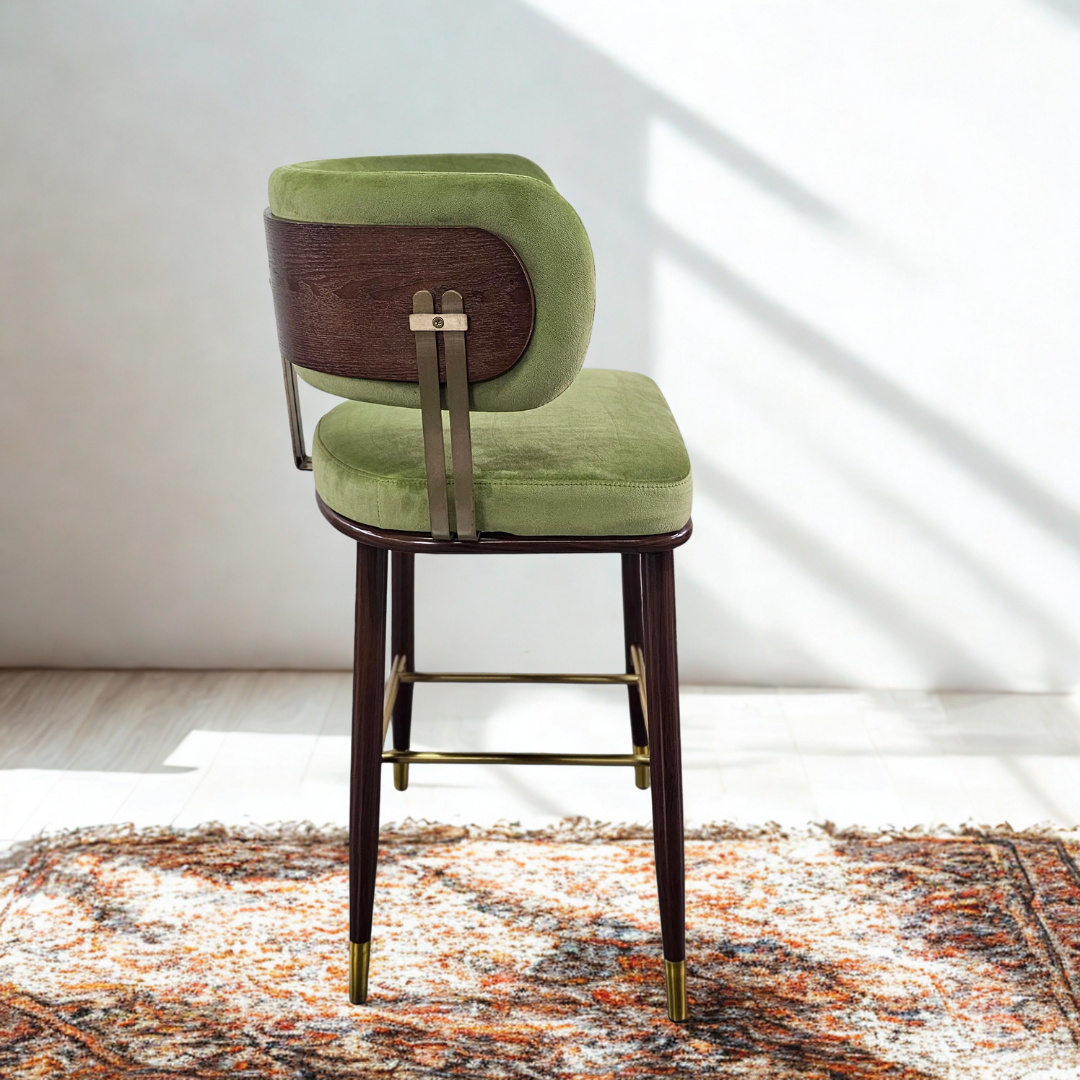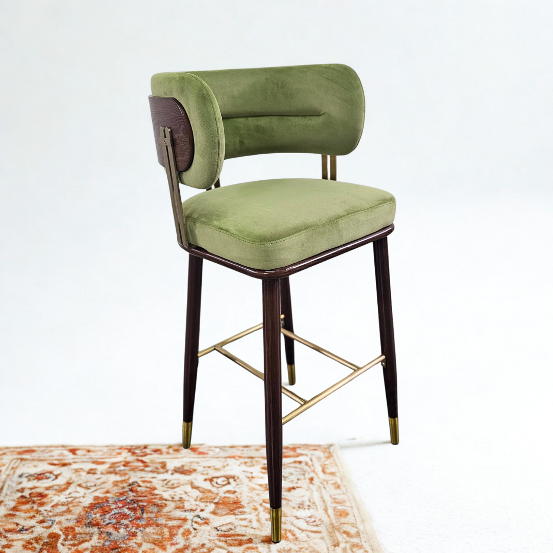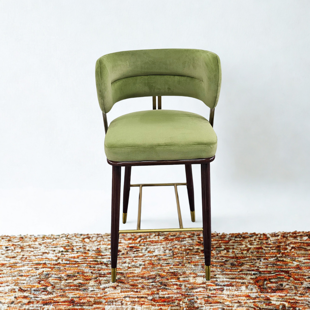 Estructura de madera maciza, refuerzos y apoyapiés de acero con acabado dorado, y asiento y respaldo acolchados con espuma de alta densidad, tapizados en tela tipo terciopelo.