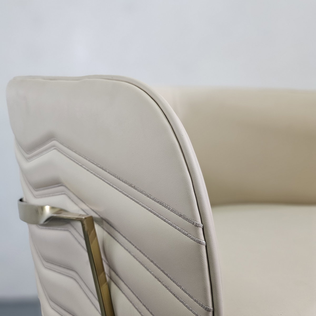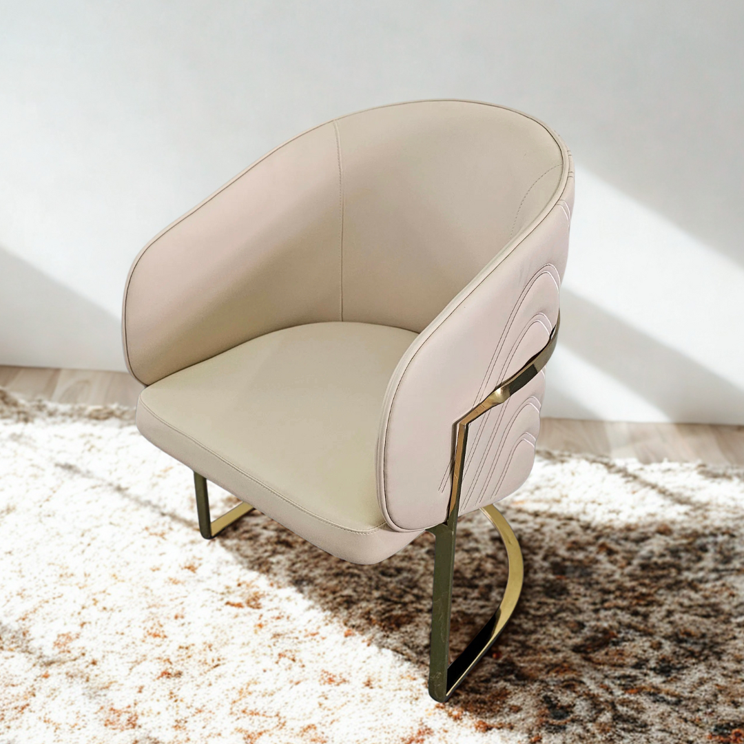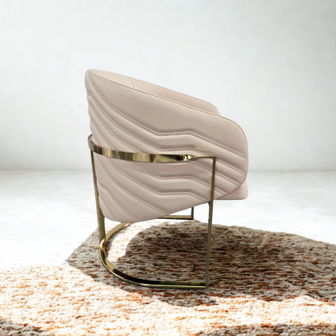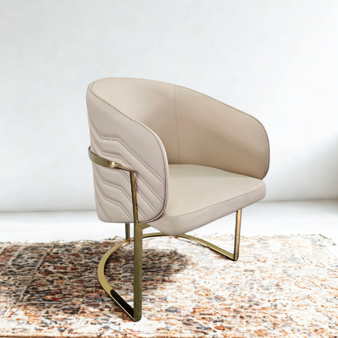 Descubre el equilibrio perfecto entre confort y estilo con el Sillón Verona. Tapizado en eco cuero beige de alta calidad, su textura suave y sus costuras en patrón zigzag aportan un detalle sofisticado y contemporáneo. Su estructura metálica en acabado dorado no solo brinda estabilidad, sino también un toque glamuroso que eleva cualquier espacio.