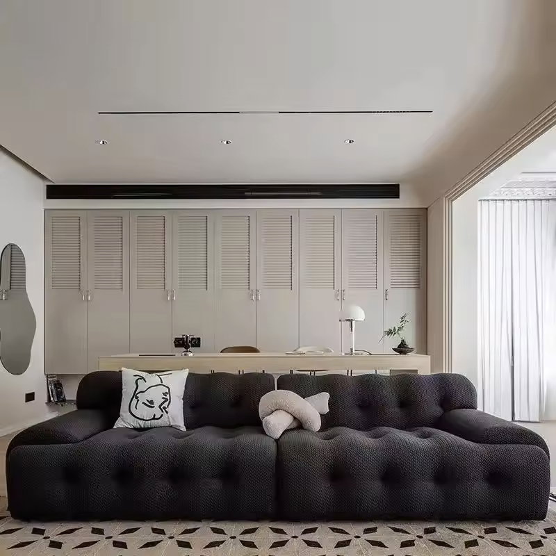 Sofá de diseño minimalista con una silueta redondeada y tejido elástico 3D, transpirable y cómodo. Cuenta con asiento de espuma de alta densidad 45D, ofreciendo un fuerte apoyo y mayor comodidad con el tiempo.