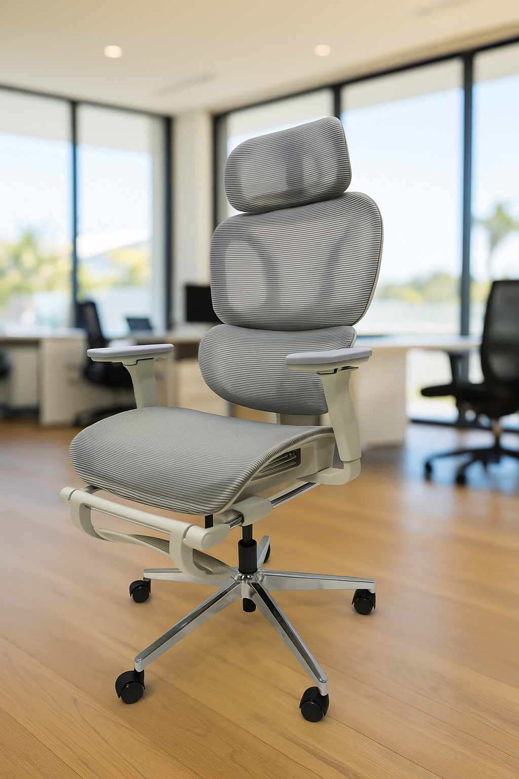 Fabricada en tela de malla transpirable, mantiene la frescura incluso en largas jornadas de trabajo. Respaldo alto con soporte lumbar ajustable Apoyabrazos ergonómicos, regulable Cabecera con movimiento para mayor comodidad Base metálica resistente con ruedas Ideal para home office u oficina, combinando confort, durabilidad y estilo moderno.