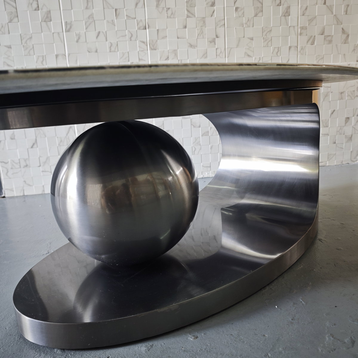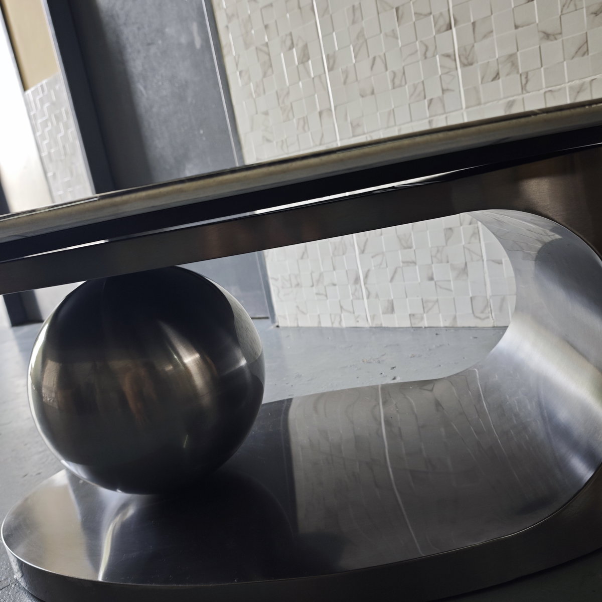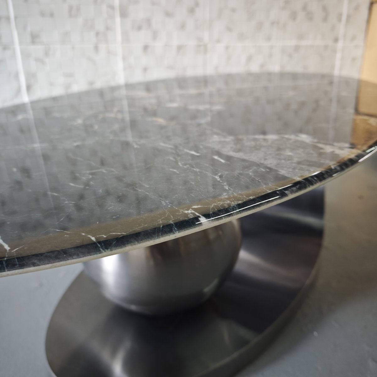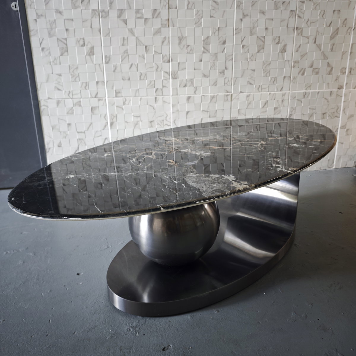 La mesa presenta una leve deformación en la base metálica, lo que impide que los tornillos ajusten completamente el mármol superior. Además, tiene un pequeño desprendimiento del acero en la parte inferior.