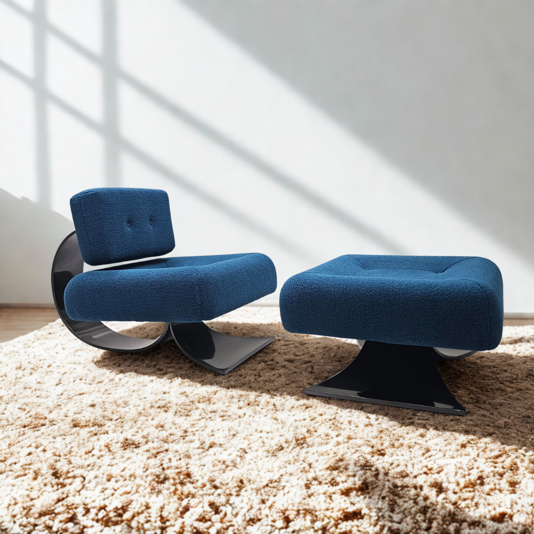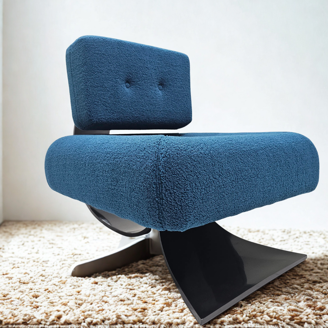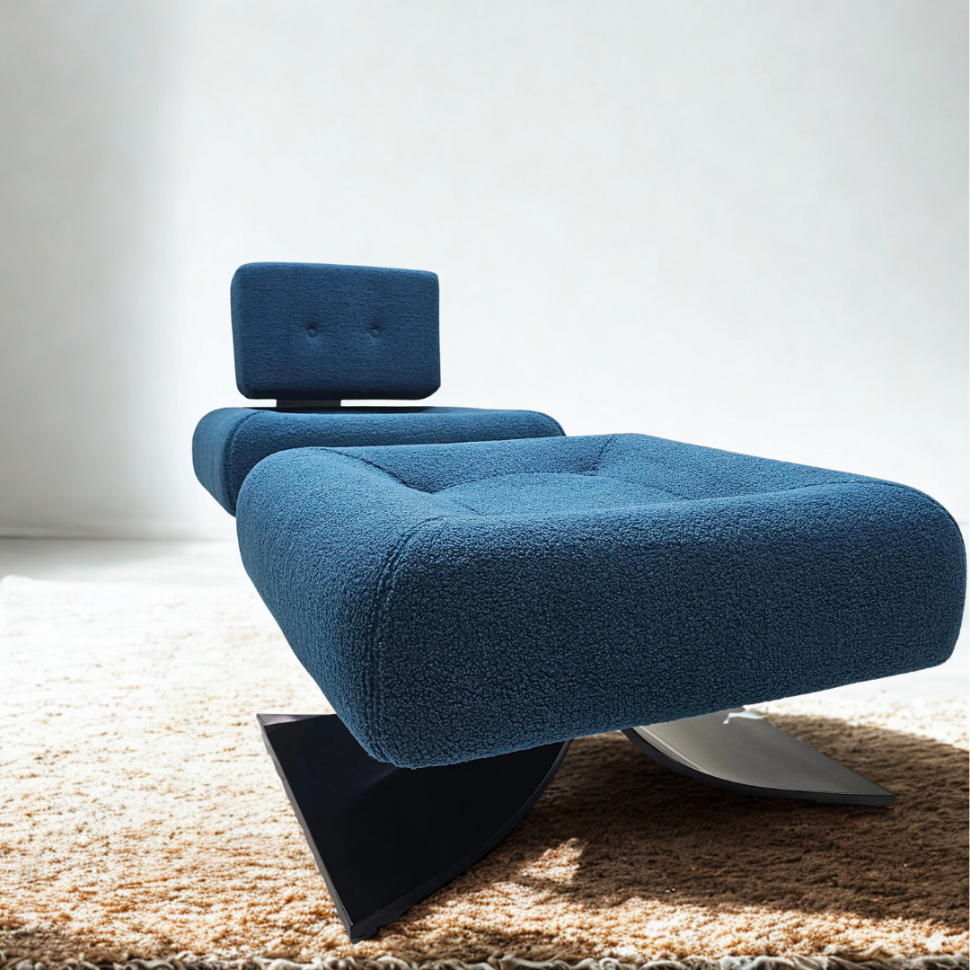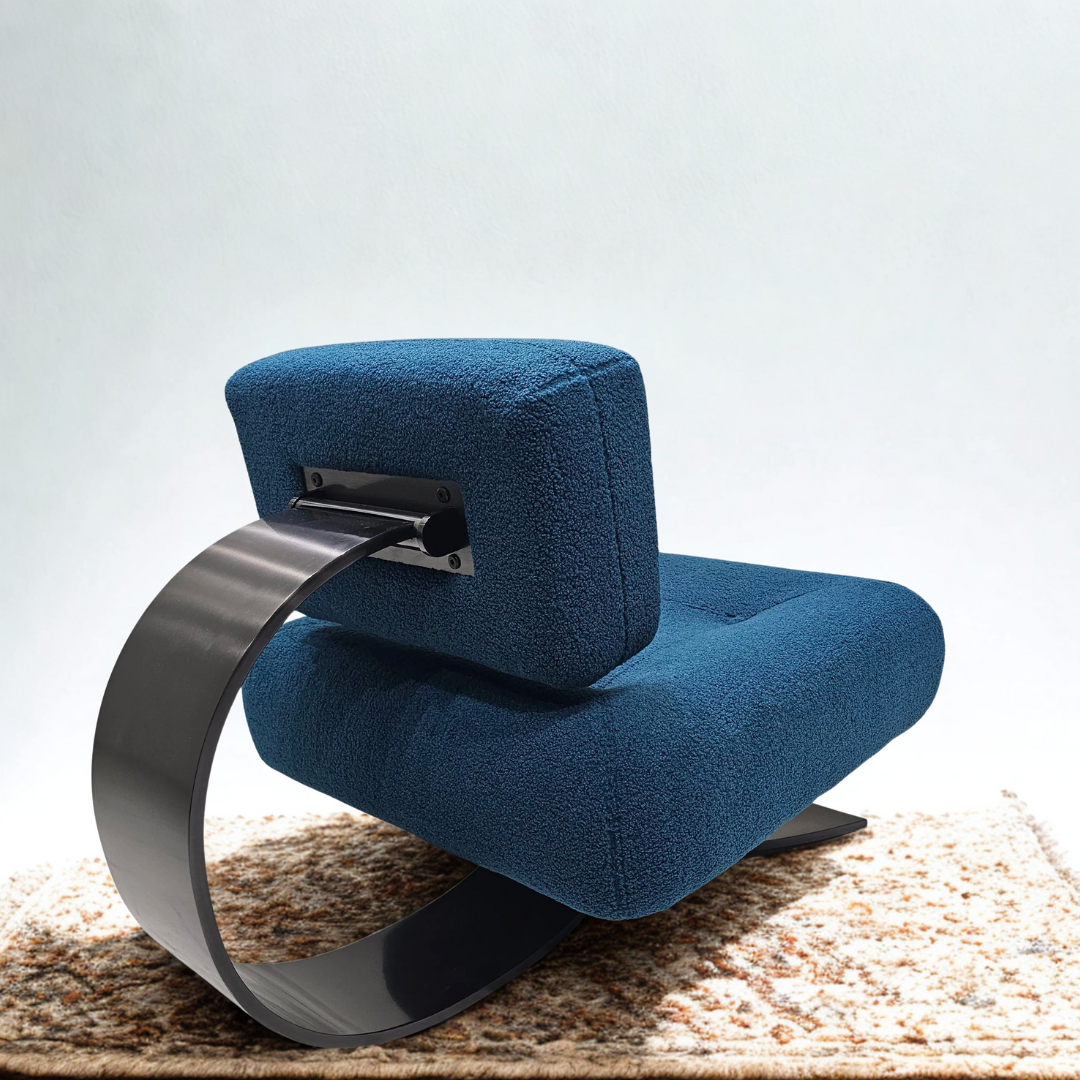 Con estructura curva de acero inoxidable cepillado, asiento amplio de tela negra y detalles en cuero.