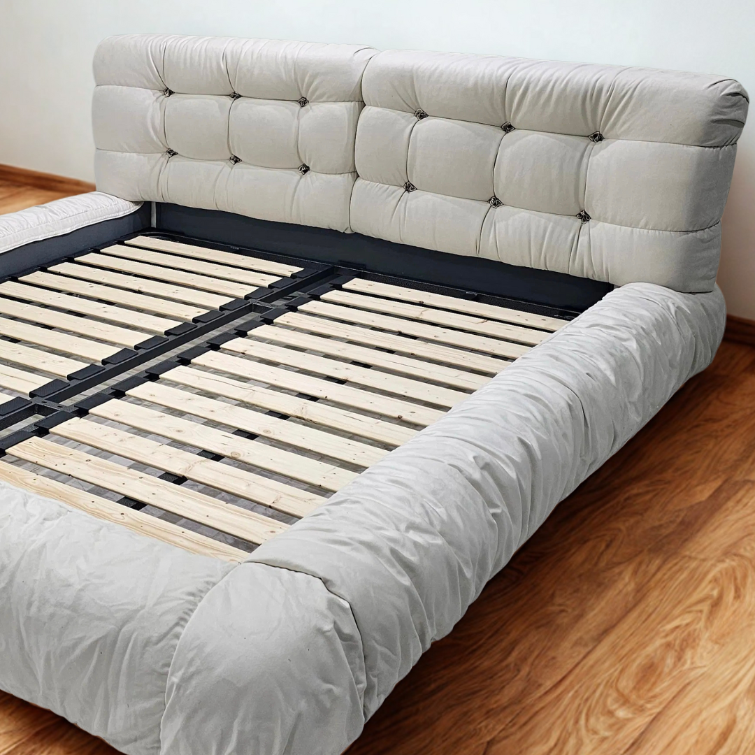 Tela utilizada en el paño esmerilado, esqueleto de acero marco de madera maciza, y la capa media con material de PU resistente al agua, no sólo resistente al desgaste resistente a los arañazos buen cuidado, lleno de textura, como los colores claros no tienen miedo de fácil ensuciarse, tire del botón ligeramente deprimido, de modo que el respaldo naturalmente presente esponjosa cóncava y convexa sensación, la sensación real de la cama de la nube del nombre es bien merecido!
